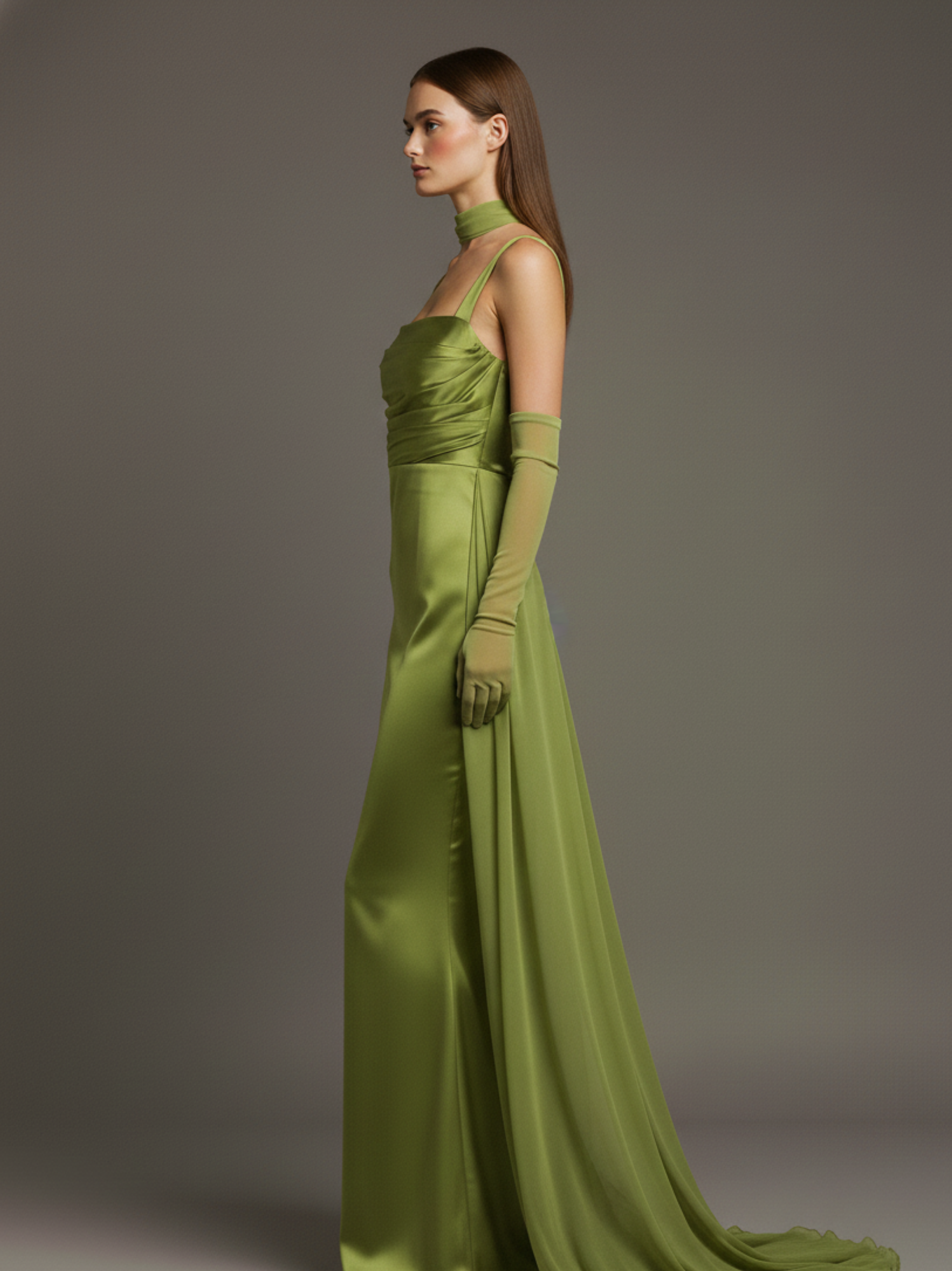 Este es nuestro vestido largo sin espalda y con cuello halter de satén Adriana