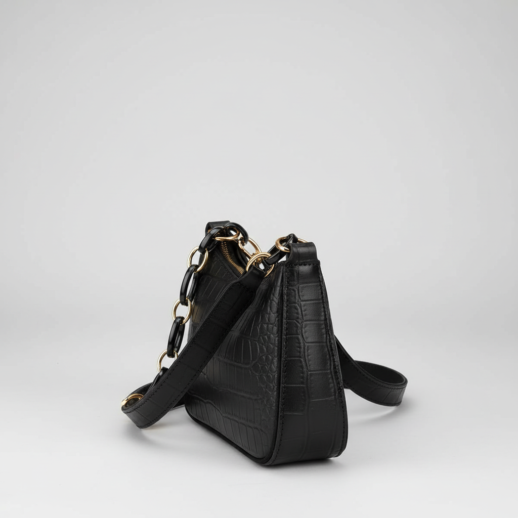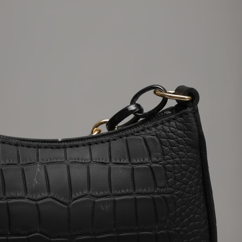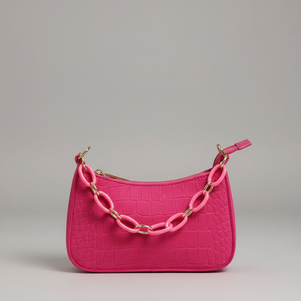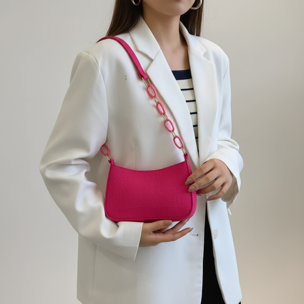 Bandoulière en chaîne métallique remarquable : La bandoulière en chaîne métallique audacieuse ajoute une touche moderne et avant-gardiste, faisant de ce sac un accessoire qui se démarque.