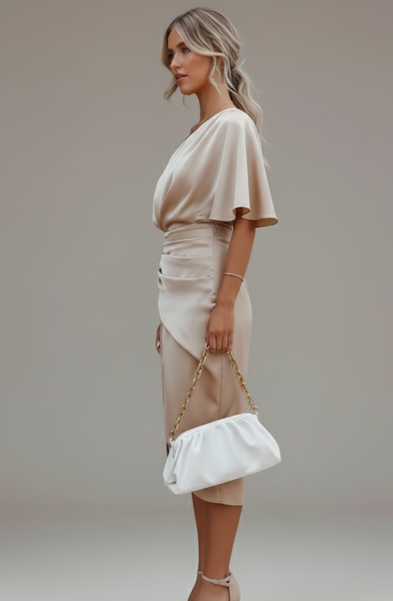 Chic et sculpturale, cette robe midi asymétrique en satin à une épaule présente une manche drapée avec élégance et une jupe portefeuille asymétrique. La taille froncée flatte la silhouette, tandis que la fluidité du satin apporte une touche d'élégance naturelle – idéale pour les soirées ou les dîners chics.
