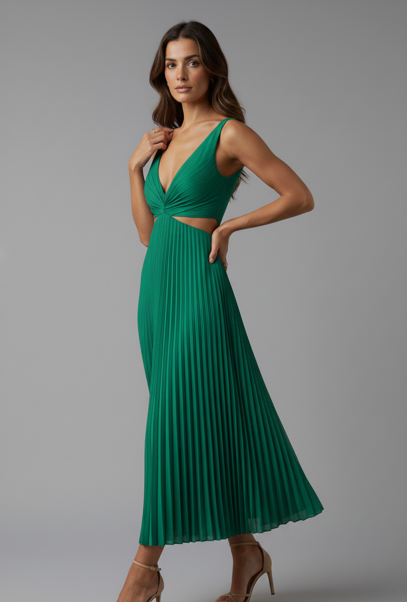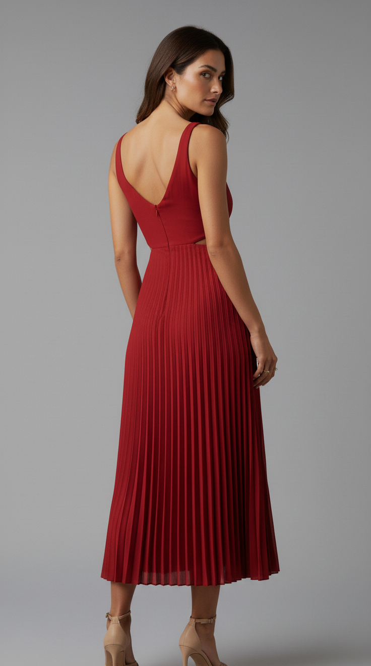À la fois gracieuse et audacieuse, cette robe midi mêle des plis romantiques à une découpe audacieuse — pour la femme qui n'a jamais peur de faire une entrée remarquée.
