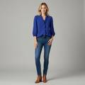 Avec ses délicats volants et ses manches vaporeuses, ce chemisier offre une silhouette gracieuse qui convient à toutes les occasions, des week-ends tranquilles aux journées de travail élégantes. Féminin, intemporel et facile à porter.
