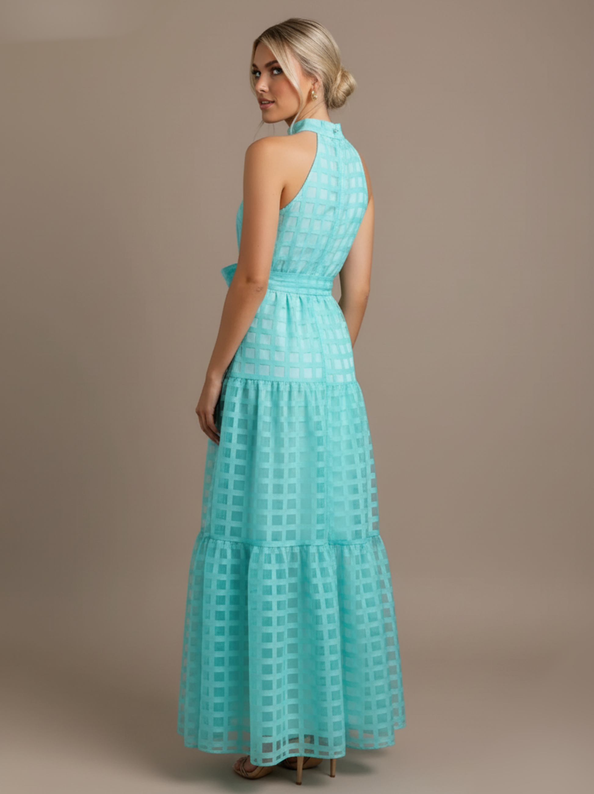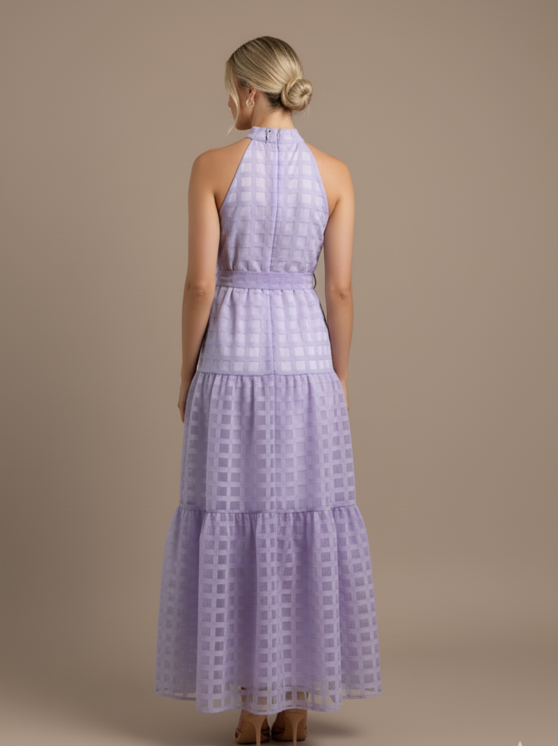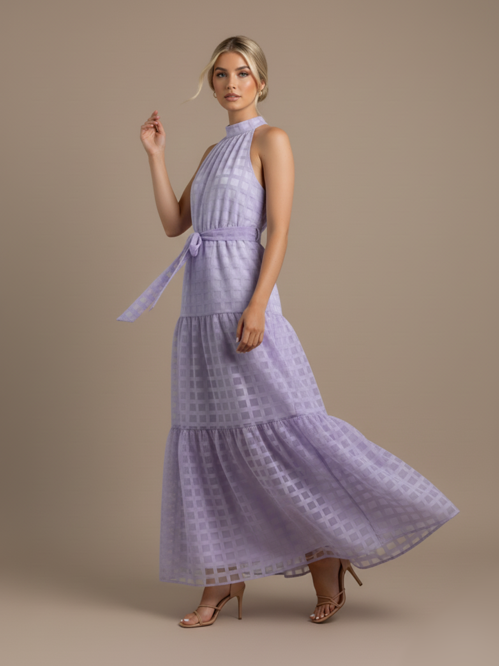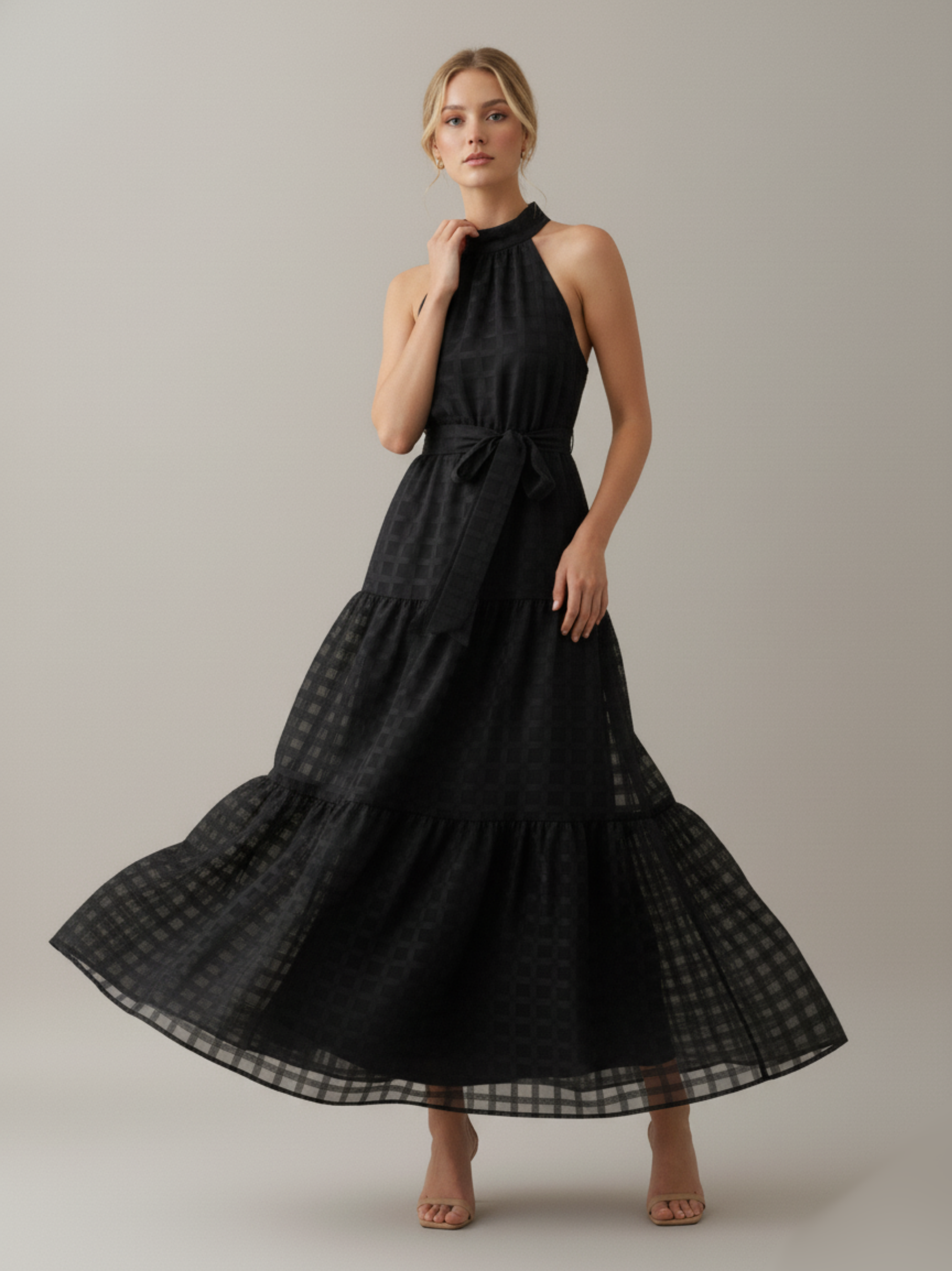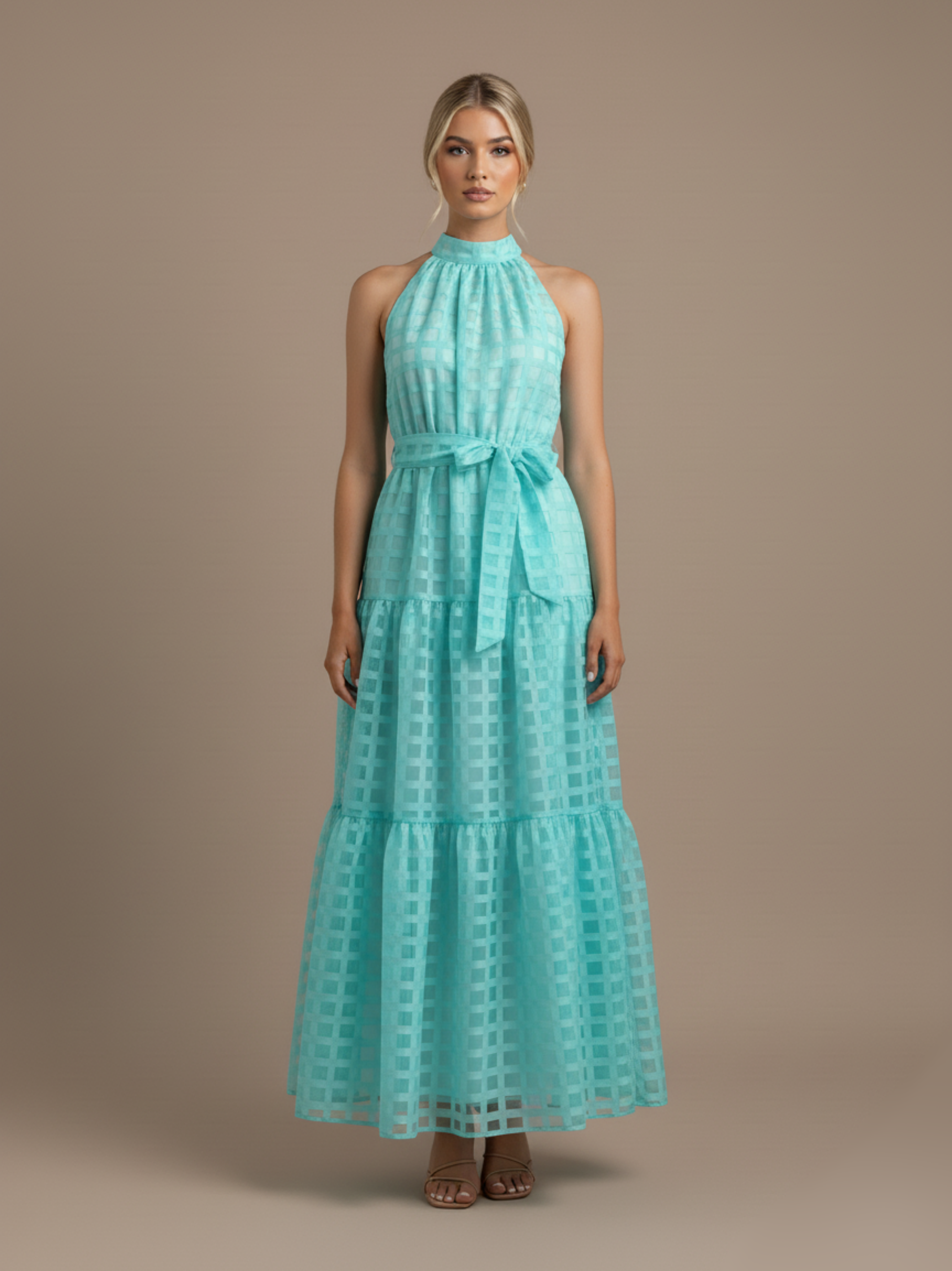 Playful yet refined — this halter maxi dress features a sheer grid-textured overlay, a belted waist tie, and soft tiered volume for an effortlessly romantic finish.
