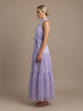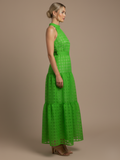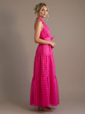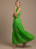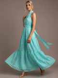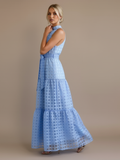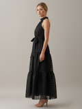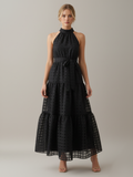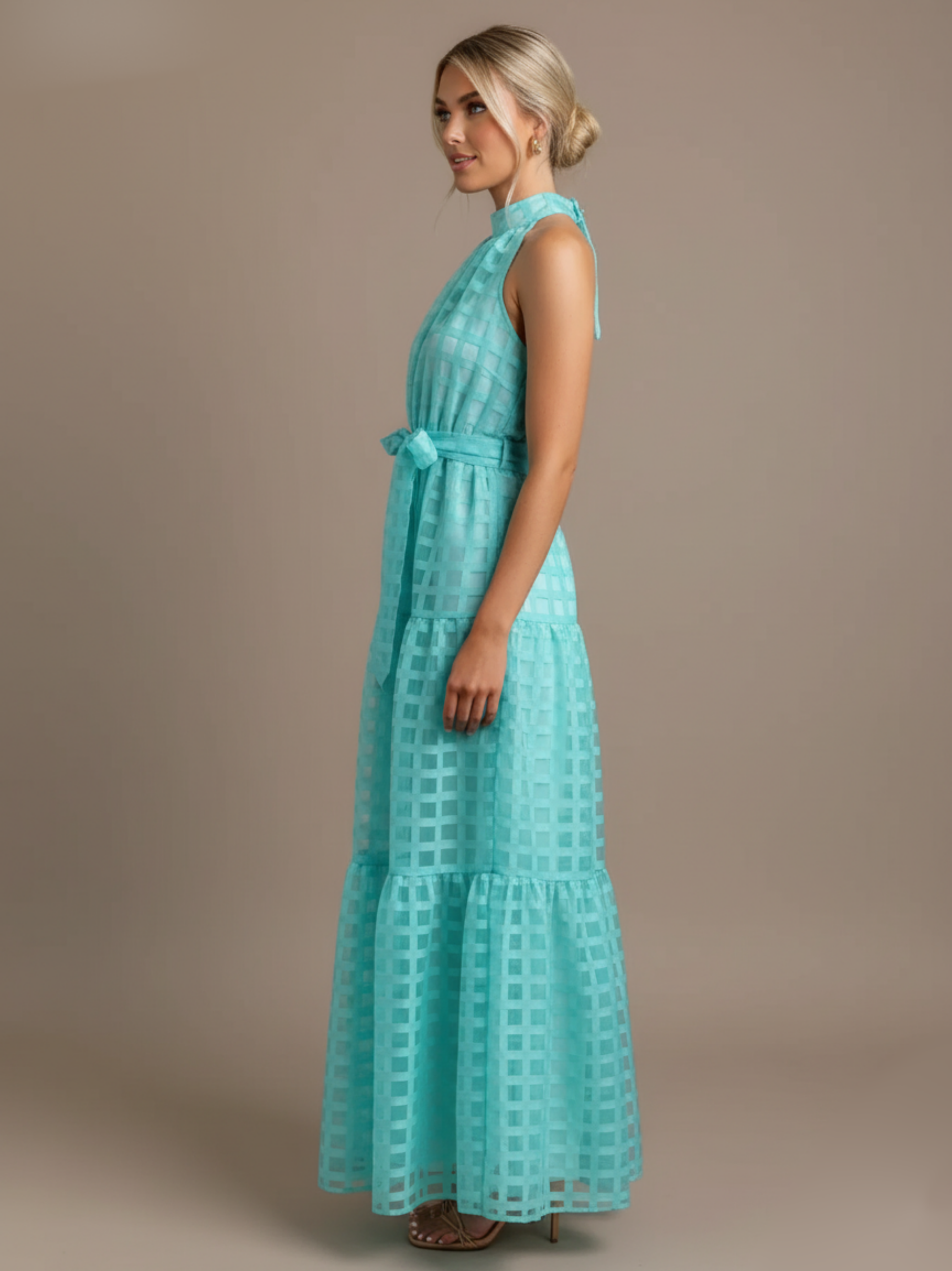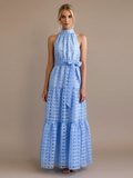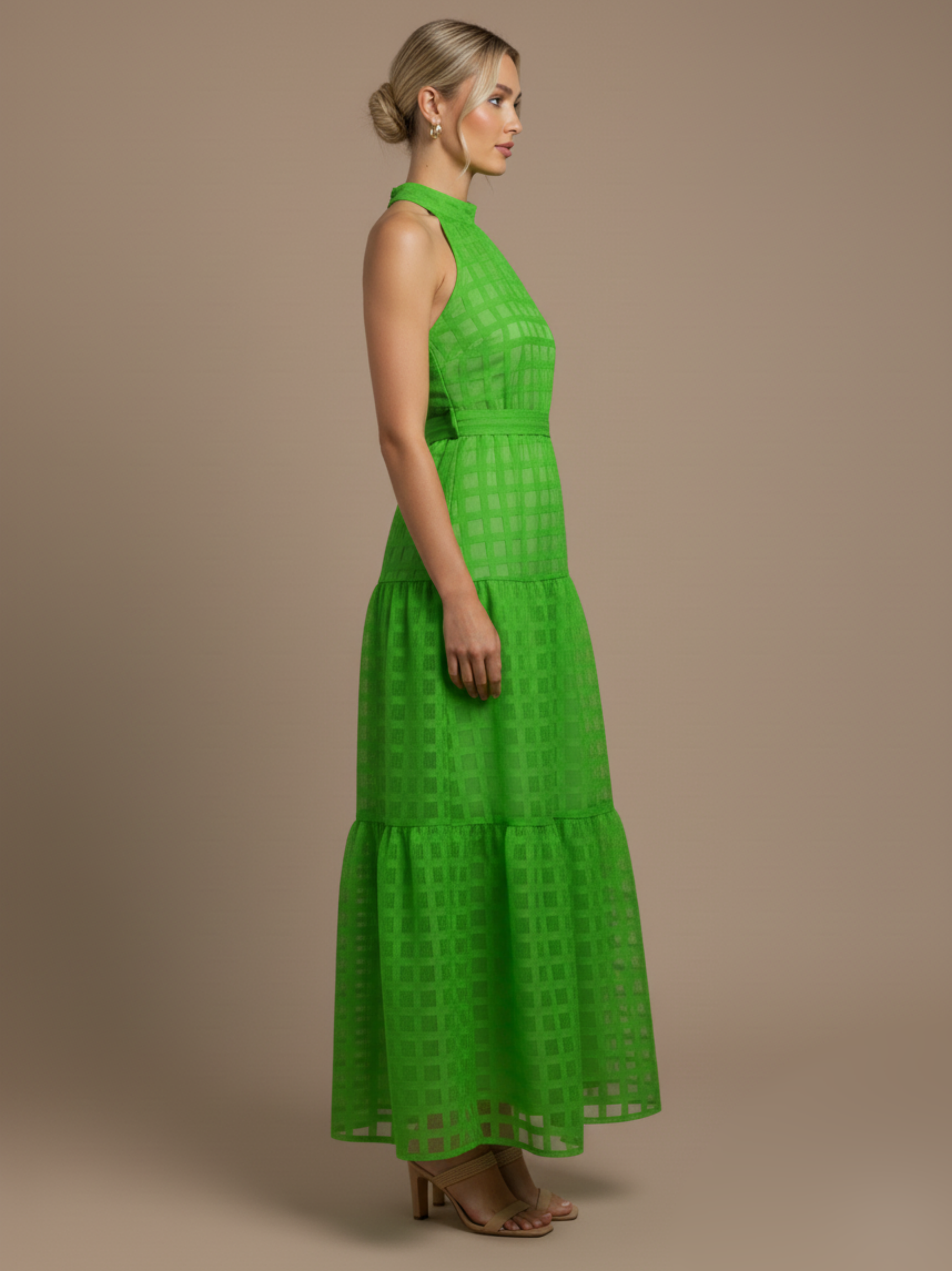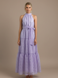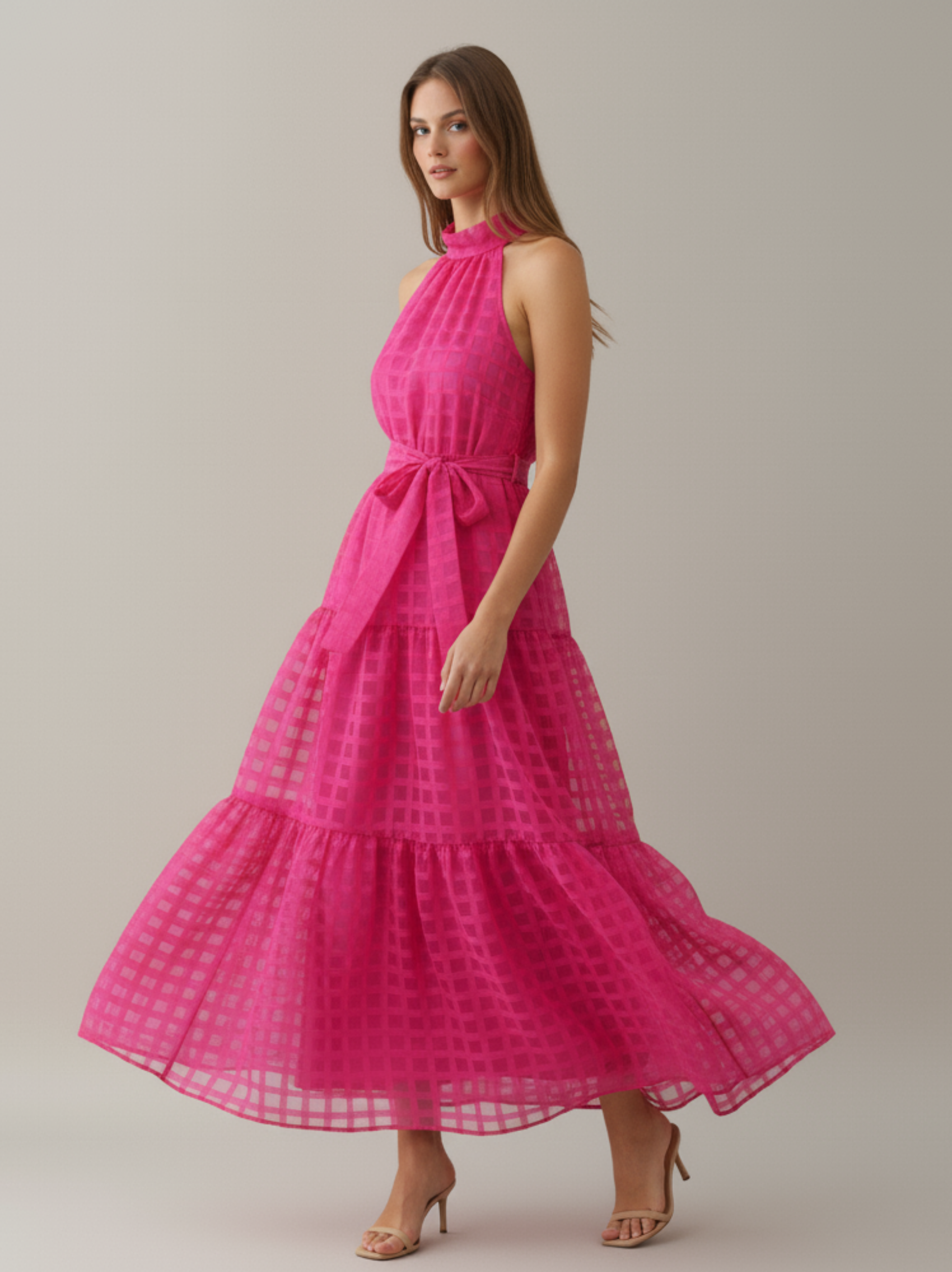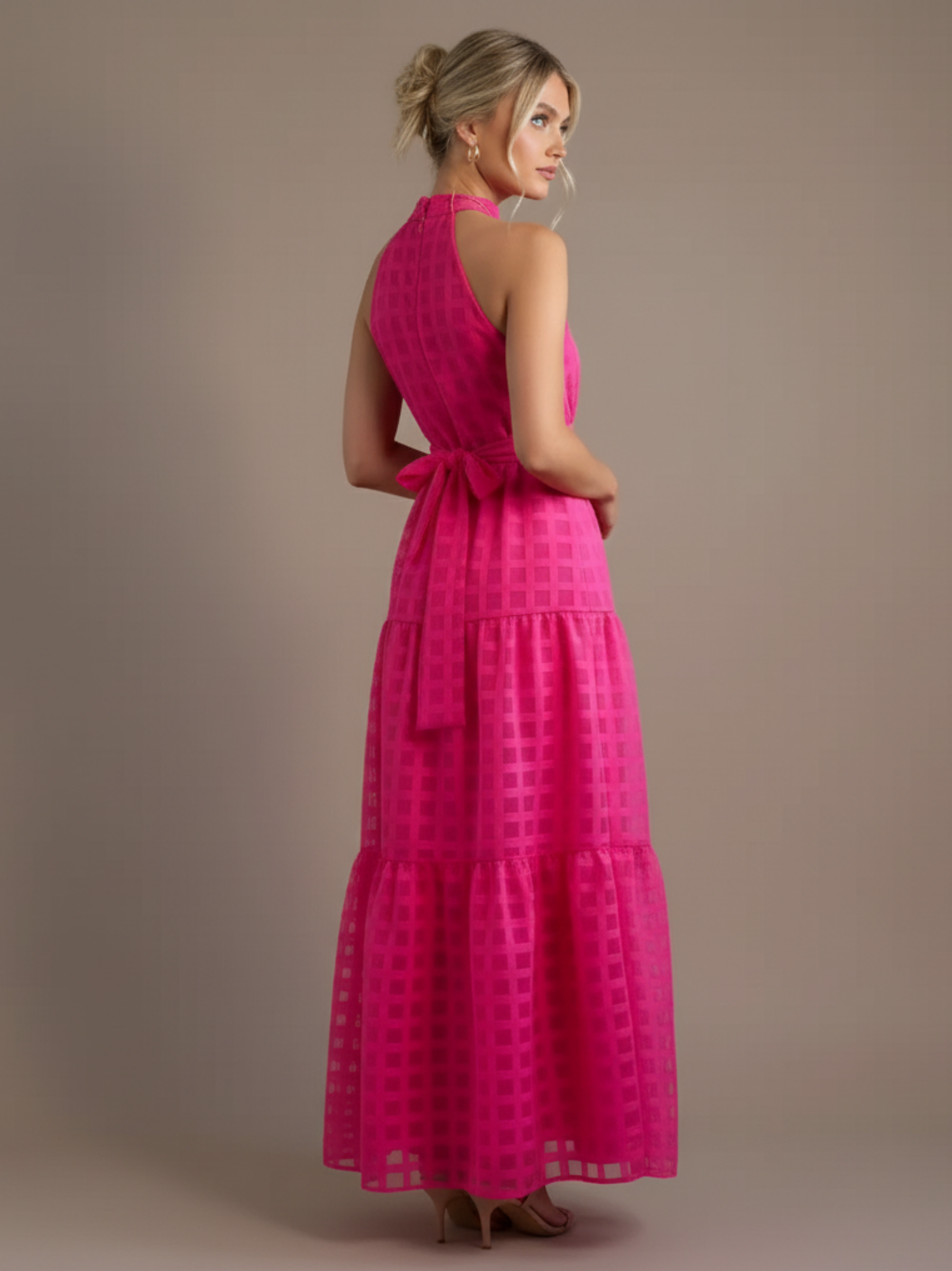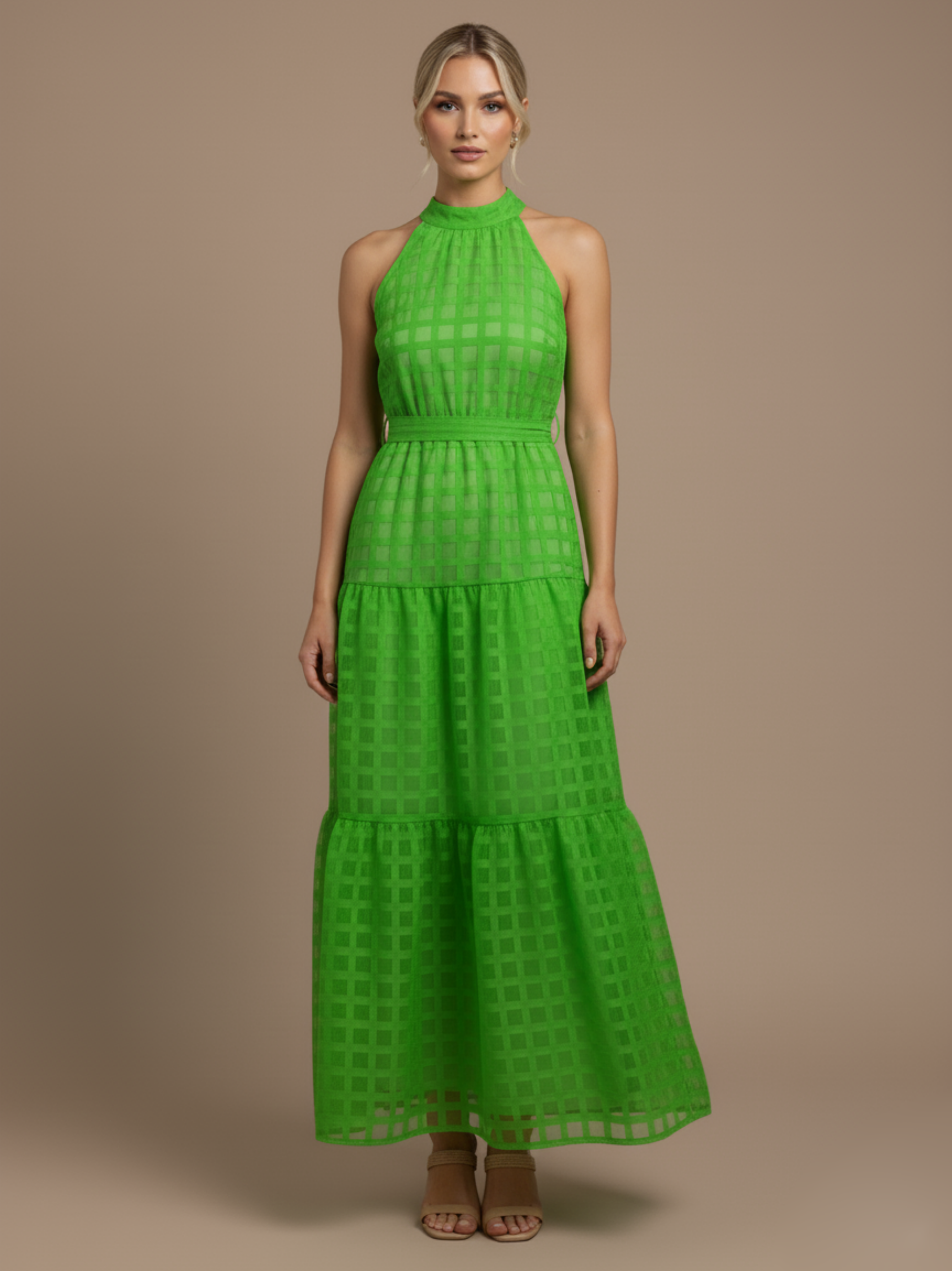 Playful yet refined — this halter maxi dress features a sheer grid-textured overlay, a belted waist tie, and soft tiered volume for an effortlessly romantic finish.