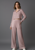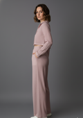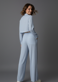 Este é o nosso conjunto de blusa cropped de manga comprida e calça de modelagem relaxada.