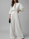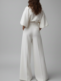 Este é o nosso macacão Elara branco de pernas largas.