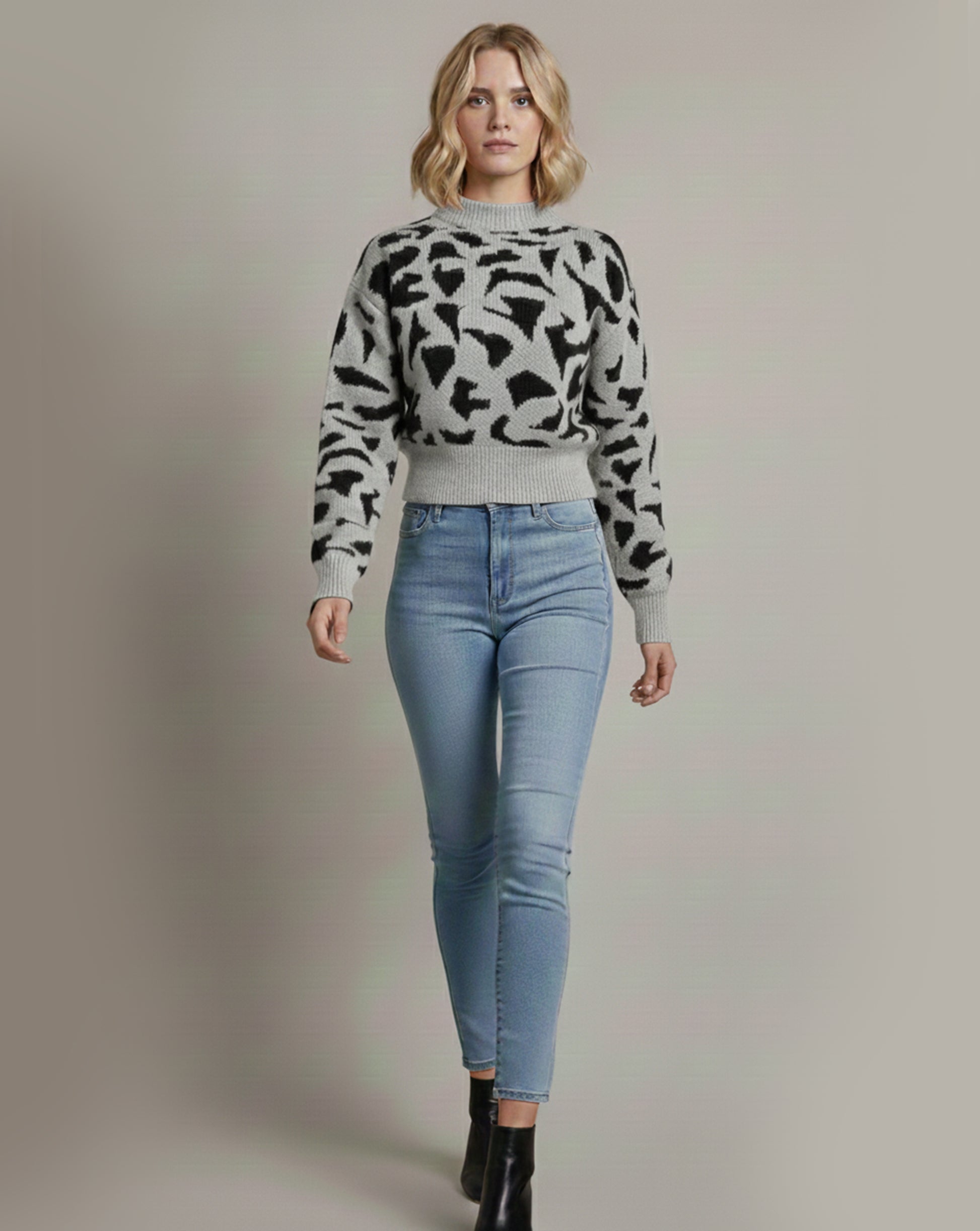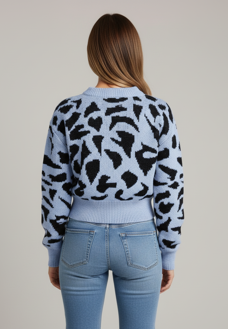 Estampa de Leopardo Chamativa: Com uma estampa de leopardo ousada e elegante, este suéter adiciona um toque moderno ao seu visual, tornando-se uma peça de destaque em qualquer guarda-roupa.