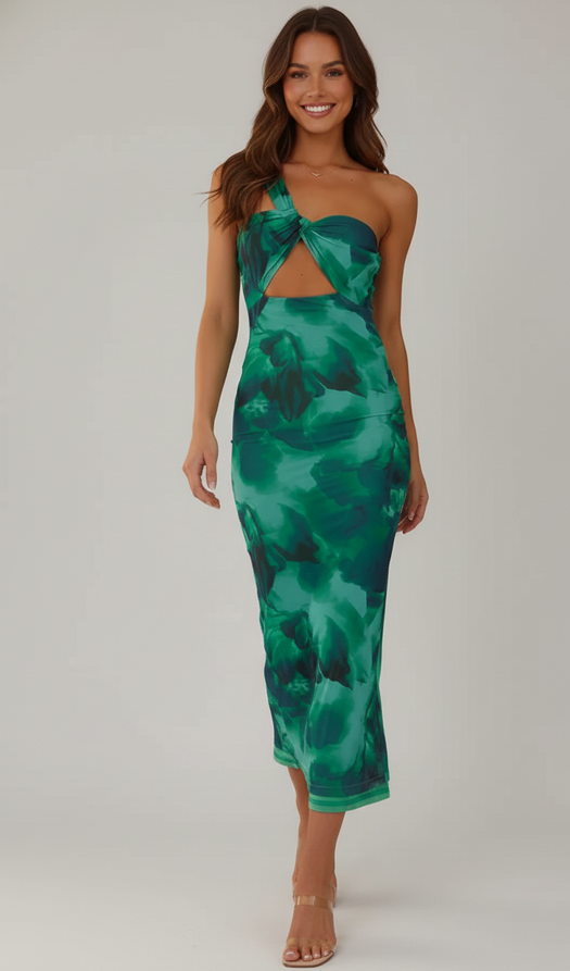 Este é o nosso vestido midi com estampa aquática e alças assimétricas.