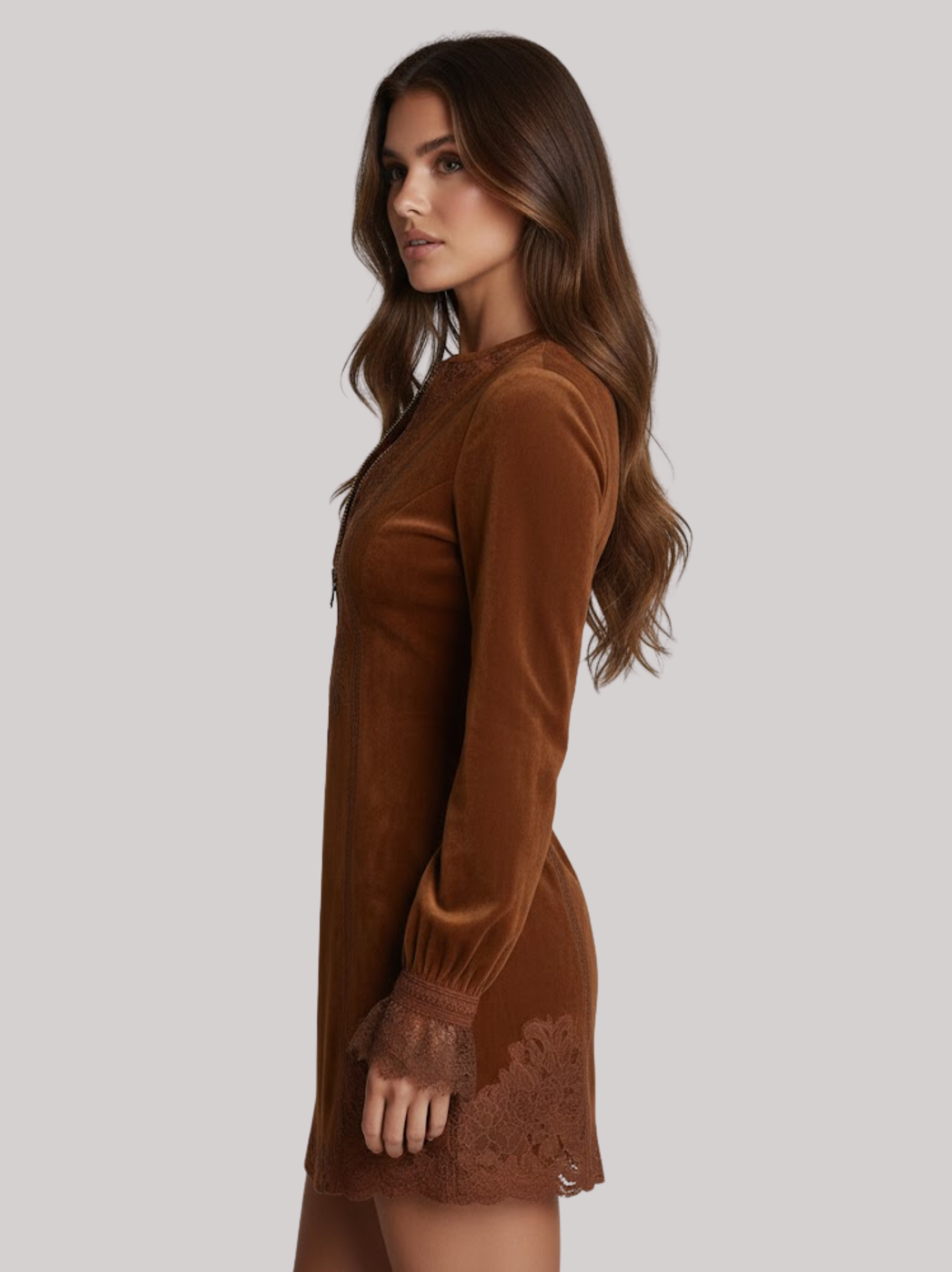 • Zarif Dantel Yama İşi: Yumuşak dantel detaylar tasarıma zarafet katıyor, kadınsı bir kontrast oluşturuyor ve elbiseye eşsiz bir işçilik hissi veriyor.